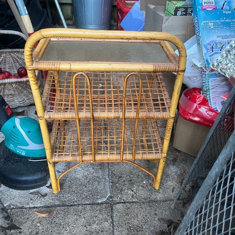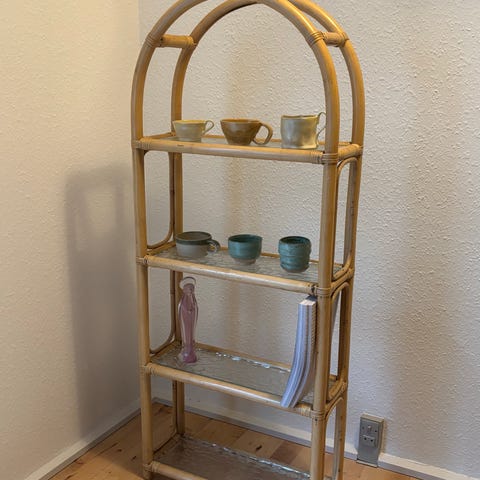 Fineste hylde i bambus og glas, vintage fra 1960erne.