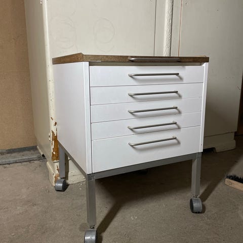 Ikea skuffemodul med 3 skuffer. Skuffemodulet er i hvidlakeret metal. Der medfølger nøgle til aflåsning af de 2 øverste skuffer. Nederste skuffe kan ikke aflåses. Modulet har flg. mål: bredde 40 cm, dybde 47 cm og højde 56 cm. Skuffemodulet er i pæn stand, med mindre brugsspor, såsom små skrammer/ridser. Lagerbestand: 1 stk.