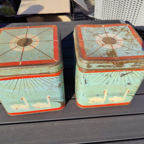 Vintage metal opbevaringsdåser sæt bestående af 5 stykker i forskellige farver og designs. de kan ses og afhentes i Grenaa efter aftale eller sendes med dao