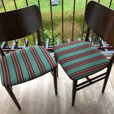 Set of 8 teak and oak side chairs designed by Niels & Eva Koppel, Denmark.