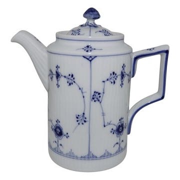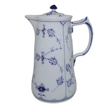 Royal Copenhagen Musselmalet Riflet, lille chokoladekande med træhåndtag og låg med udluftning til den varme chokolade.