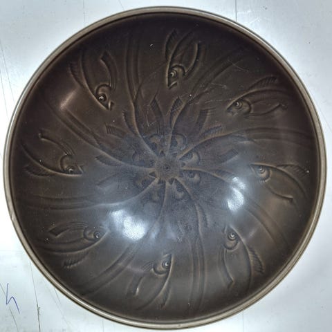 Aluminia Solbjerg kunstfajance, grønt bæger med fisk.