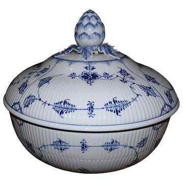 Vi har fået en stor samling porcelæn af Musselmalet og Blå Blomst fra en tidligere Blåmalerinde på Den Kongelige Porcelænsfabrik. Faktisk fra den blåmalerinde, som er den eneste i nyere tid, der har været ansat i over 50 år. Vi har sat en del til salg, men der kommer mange flere i dele til salg i den kommende tid.