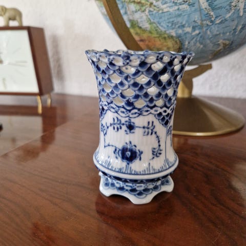 Royal Copenhagen Musselmalet Riflet, pibe eller cigaraskebæger med pind i midten.