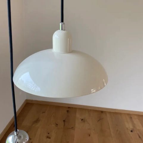 Hvid Kaiser Dell Idell loftslampe med sort stofledning.