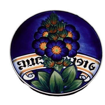 Der er en misfarvning som primært ses på bagsiden, se fot, samt svage krakkeleringer i glasuren ellers perfekt stand uden fejl.