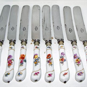 De er alle produceret i 1913 og alle har et monogram på knivbladene.