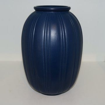 Ipsen keramik, mørkeblå vase med riller.