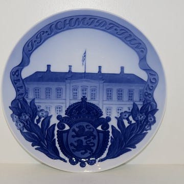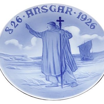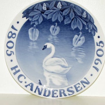 Stor Royal Copenhagen Bisquit platte dekoreret med HC Andersen omgivet af en egeløvskrans.