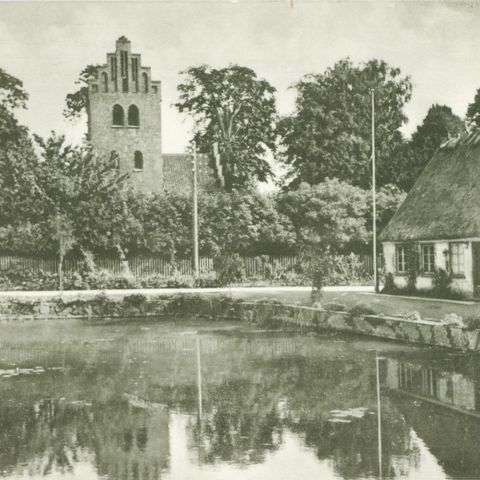 Postkort i pæn stand med Vedersø Kirke. Poststemplet i 20.7.1955.