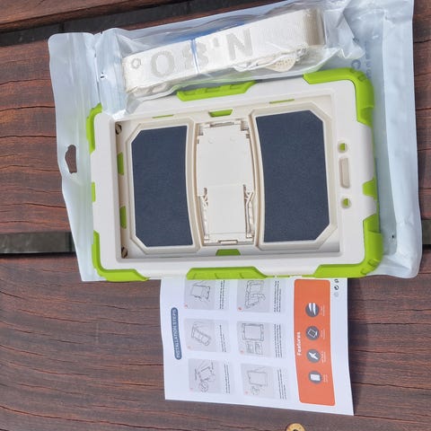 Etui cover til Appel tablet. Grønt olivengrøn army med palmetræere på. Der er også plads til en kuglepen i siden hvor den kan sidde fast med elastik. Små lommer til kort, visitkort, billede eller andet