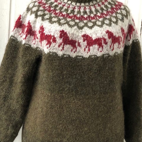 Håndstrikket i ren, maskinvaskbar uld og (heste) i blåt glittergarn.