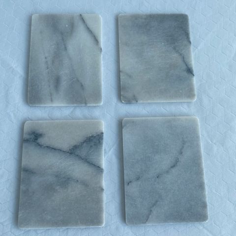 6 stk. platter i marmor, selvfølgelig med varierende farve og motiv, da det er en natursten. Enkelte af dem har mere synlige brugsspor, som det fremgår af billederne. De er ikke fuldstændigt identiske i størrelse, men de fem måler ~15 cm i diameter og den sidste er lidt større, og måler ~16 cm.