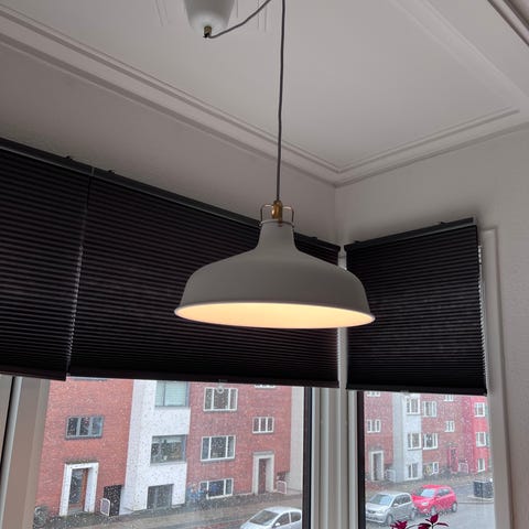 Flot, hvid kogleformet lampe fra IKEA. Kan ikke huske hvad modellen hedder dog 😅