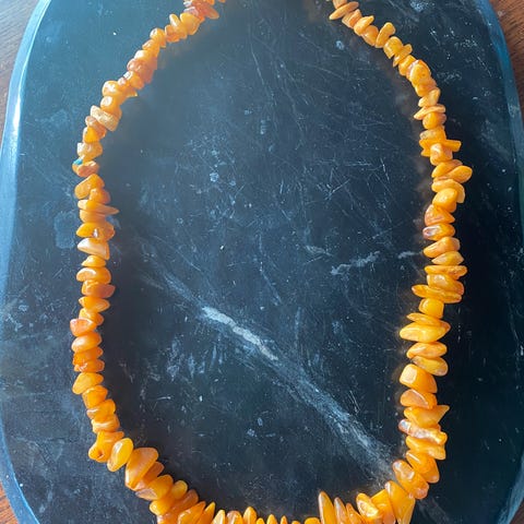 Har også en kæde med lidt mindre ravstykker, se en af billederne.