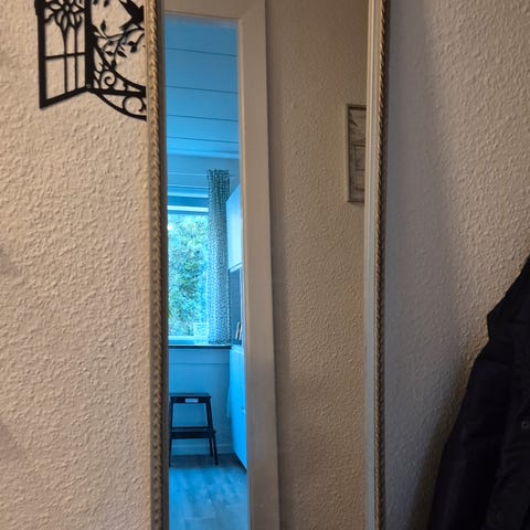 Spejl med hvid ramme. 58x98cm. Kan hænge begge veje.
