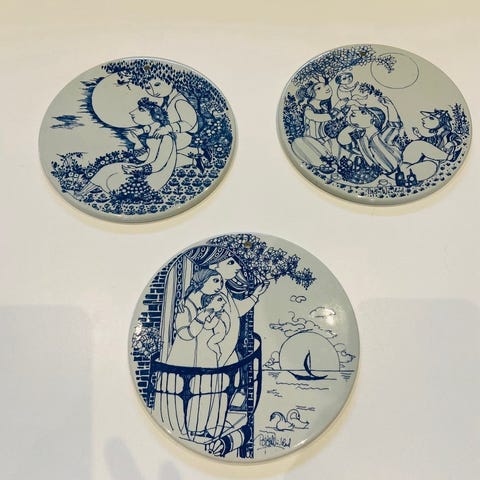 Keramik, Smørebrikker, Bjørn Wiinblad, Seks charmerende Bjørn Wiinblad smørebrikker i sort (februar-marts-april-maj-juni-december) med huller til evt ophængning, Ø 15 cm. Kunstnerens fortællelyst ses tydeligt, når man ser på Bjørn Wiinblads smørebrikker med op til 12 forskellige motiver, der afbilleder et kærlighedsforhold måned for måned i løbet af et helt år. Alle som nye - nypris 99,-/stk. Gi' et bud - fx halv pris for alle seks