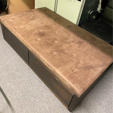 Annoncen er genindrykket, efter bænken på det ene ben fået et lille tryk, så den har sluppet en milimeter i samlingen. Bænken er stadig helt pæn og fuldt funktionel (og måske en person med snilde kan lime det - personligt kan jeg ikke). Af den grund nedsat nu.
