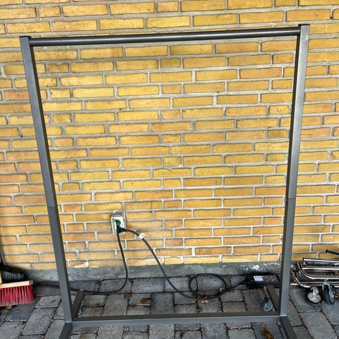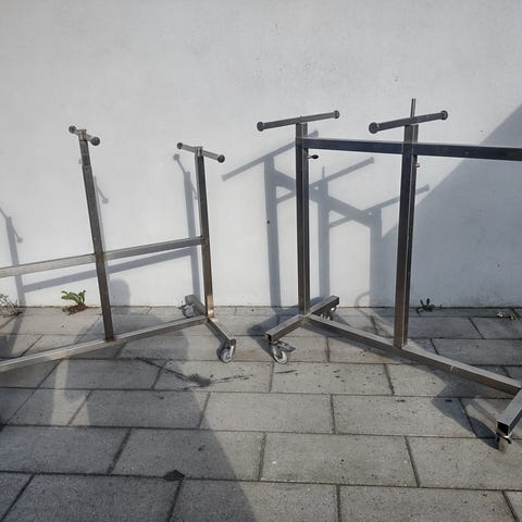 2 stk. solide med god vægt, så de bliver stående. Er brugt som gadestativer i tøjbutik, mulighed for påsæt af skilteholder. Mulighed for at fastgøre dem til underlag.