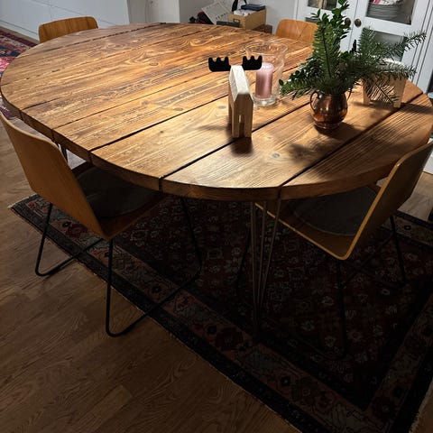 Oprindeligt var bordet rundt og sæbebehandlet, men vi har fået sat et midterstykke i - se billede.