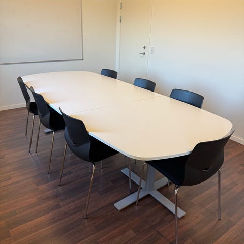 Klassisk konferencebord med bordplade i hvid laminat og krom T-stel.