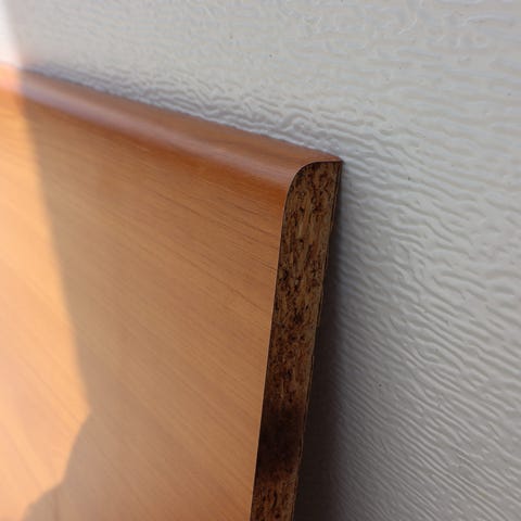 Spånplade med laminat i bøg, 4100x394x19mm velegnet til hylder, låger osv. kraftig model 19mm rundet hjørner for/bag aldrig brugt direkte fra fabrik