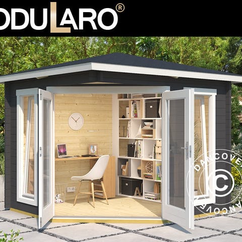 Havepavillon i træ i massivt 40 mm nordisk gran med flot udkig og dobbelt dør, som føjer det indre af pavillonen sammen med haven og terrassen på smukkeste vis. Bemærk den pladsbesparende hjørneindgang. De store vinduer giver et flot lysindfald. Nyd haven hele året rundt i al slags vejr ved at opholde dig inde i denne skønne kvalitetspavillon i træ. OBS! Tagbeklædning er IKKE inkluderet. Vi anbefaler, at du undersøger det store udvalg af tagbeklædninger i dit lokale byggemarked. Modularo® er et moderne livsstilsbrand, der tilbyder holdbare kvalitetsprodukter i massivt træ og et tidssvarende design, som kan være med til at gøre dit haveliv endnu skønnere.