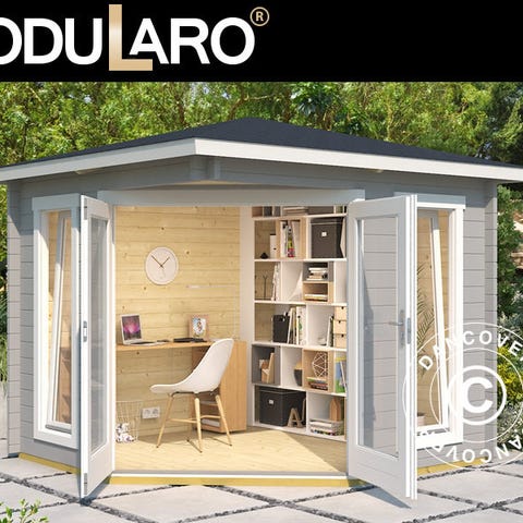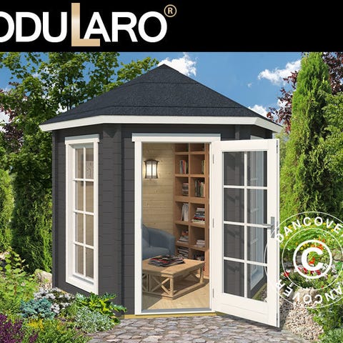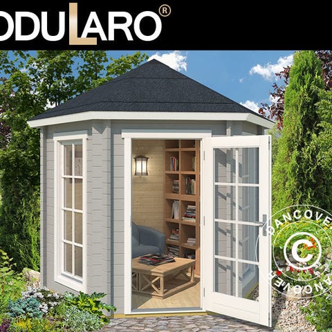 Havepavillon i træ i massivt 44 mm nordisk gran med flot udkig og dobbelt dør, som føjer det indre af pavillonen sammen med haven og terrassen på smukkeste vis. De syv store vinduer giver et flot lysindfald. Nyd haven hele året rundt i al slags vejr ved at opholde dig inde i denne skønne kvalitetspavillon i træ. Bemærk venligst, at rammer på dør og vinduer er malet hvide. OBS! Tagbeklædning er IKKE inkluderet. Vi anbefaler, at du undersøger det store udvalg af tagbeklædninger i dit lokale byggemarked. Modularo® er et moderne livsstilsbrand, der tilbyder holdbare kvalitetsprodukter i massivt træ og et tidssvarende design, som kan være med til at gøre dit haveliv endnu skønnere.