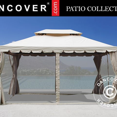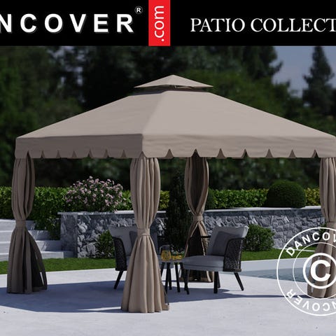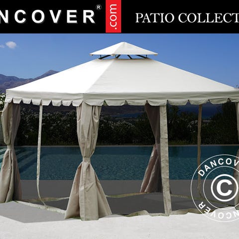 Majestætisk havepavillon med flot kiphøjde og smukke gardiner. Osiris danner en smuk og eksklusiv ramme omkring ethvert udendørsarrangement herunder middage og særlige begivenheder. Myggenet gardin og lukket gardin medfølger. Frisen nederst på tagdugen er udstyret med et elegant mønster.