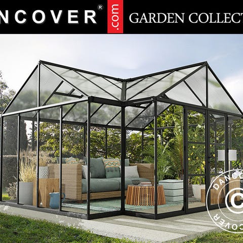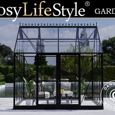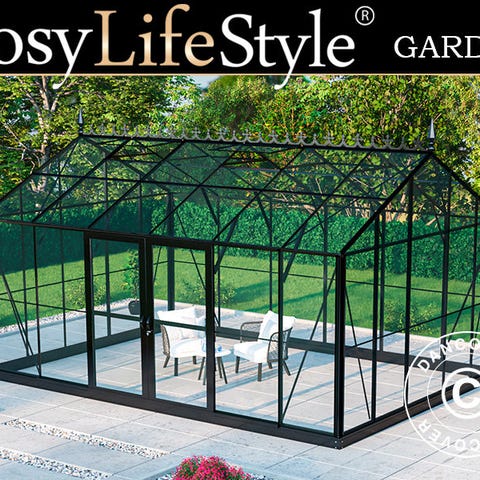 Elegant orangeri/drivhus med en stærk aluminiumsramme og 4 mm hærdet glas. Den elegante konstruktion har en bred dobbelt skydedør, der sikrer let adgang. Luk dobbeltdøren helt op og gør drivhuset til en integreret del af haven. Det smukke orangeri eller drivhus kan udvide havesæsonen, skabe et fantastisk rum hvor du kan slappe helt af samt et sted, hvor du kan dyrke lækre frugter, grøntsager og smukke blomster.