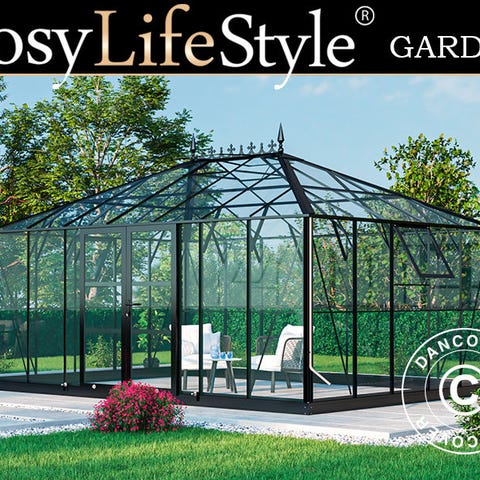 Orangeri, drivhus glas 13,3m², 4,45x2,99x2,95m m/sokkel og tagudsmykning, Sort