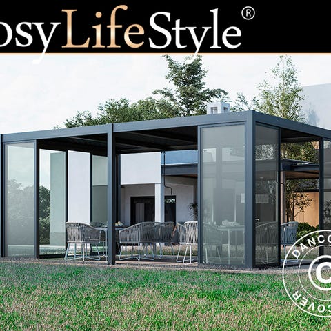 Denne eksklusive bioklimatiske pergola pavillon med et komplet sæt skydedøre i 8 mm glas vil se fantastisk ud de fleste steder - i din have, på terrassen og ved en pool. Det moderne og elegante look vil passe overalt, og du kan bruge pavillonen til skygge og læ for blæst og regn. Glaspanelerne i hver sidevæg er bevægelige og kan placeres sammen til højre, i midten eller til venstre, og det gør pavillonen helt åben eller lukket afhængigt af vejret og dit humør.