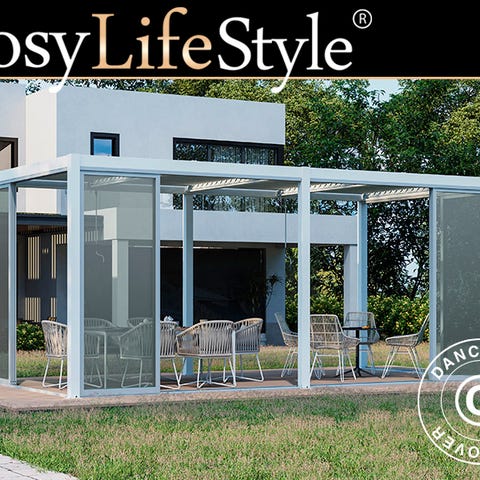 Denne eksklusive bioklimatiske pergola pavillon med et komplet sæt skydedøre i 8 mm glas vil se fantastisk ud de fleste steder - i din have, på terrassen og ved en pool. Det moderne og elegante look vil passe overalt, og du kan bruge pavillonen til skygge og læ for blæst og regn. Glaspanelerne i hver sidevæg er bevægelige og kan placeres sammen til højre, i midten eller til venstre, og det gør pavillonen helt åben eller lukket afhængigt af vejret og dit humør.
