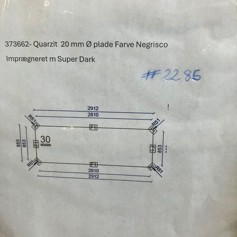 Marazzi 20 mm - Ø plade med vask (370761). Faset alle 4 kanter, mærket med F1 på plantegningen. Farve: Golden White Satin. Vask er ridset og sidder løst i, da limen har sluppet. Dimension: 2652x1230x20 mm.