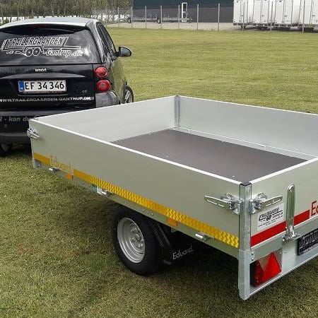 ED2314-10-63Eduard trailer 2314-1000-63En trailer der er kan bruges privat eller til let erhverv. Med denne trailer får du ikke bare en stærk og robust trailer, men en trailer du kan have mange år frem. ED2314-10-63 har 13” hjul og påløbsbremse, den er som vores andre ED2314 modeller kendetegnet vedStabil v-trækvangeGalvaniseret chassisSider i aluminiumIndvendige surringsøjerAftagelige hjørnestopler og sider der kan lægges nedNæsehjul uden klapautomatikBremset trailerDenne trailer fra Eduard kommer med påløbsbremse. Trailerens totalvægt er 1000 kg og med en egenvægt på 252 kg kan du læsse op til 748 kg. Husk at tjekke din bils registreringsattest for maksimal koblingsvægt. Det varierer fra bil til bil og det kan være dyrt at køre med for meget vægt!Stabil og fleksibel trailerDet der er kendetegnet ved ED2314-10-63 og vores andre Eduard-modeller er de aftagelige hjørnestolper. Alle fire hjørnestolper kan tages af og siderne, der alle er i aluminium, kan lægges ned. Det betyder at du har et større råderum, når du skal læsse traileren. Med alle fire sider der kan nedfældes har du mulighed for at bruge både længde og bredde, når der skal læsses.Sikring af lastSom vores andre trailere fra Eduard kommer ED2314-1000-63 med indvendige surringsøjer i bunden, der gør det muligt at sikre din last på en sikker og forsvarlig måde. En sikker fastsurring af din last er vigtig i forhold til trailerens greb på vejen.Nem at køre medMed sin relativ lille størrelse er ED2314-10-63 let at køre med. Trailerens ladmål (indvendigt) på 231x145 cm, giver traileren en lille venderadius og gør den let at manøvrere rundt med. Traileren har én Knott-aksel.Husk nummerpladePrisen er ekskl. nummerplade og nummerpladegebyr til kun 790 kr. (samme pris som hos SKAT)Ekstra udstyr til ED2314-10-63 Ekstra sider 30 cmFlad presenningHøj presenning fås i flere højder