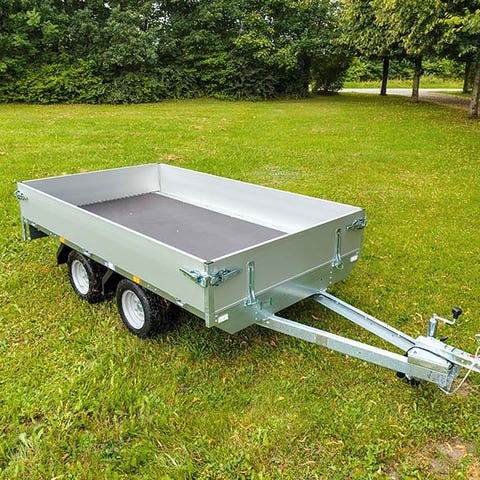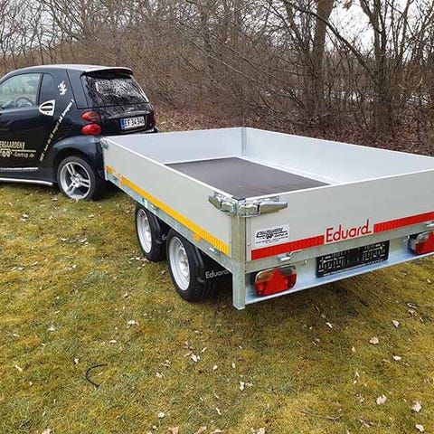 ED2514-10-56-2Her får du en boogietrailer fra Eduard med en totalvægt på 1000 kg, der kan holde til lidt af hvert. Den er stærk og robust, en trailer du kan have i mange år. ED2514-10-56-2 er som vores andre ED2514 modeller kendetegnet vedStabil v-trækvangeGalvaniseret chassisSider i aluminiumIndvendige surringsøjerAftagelige hjørnestolperSider der kan lægges nedNæsehjulEn boogietrailer velegnet til tung lastHar du brug for en trailer til at køre med fx mindre maskiner, er det en fordel med en boogietrailer. En boogietrailer har to aksler og står meget bedre fast på vejen, når du har tung last på traileren. Den slingrer ikke så let og giver en bedre køreoplevelse, samtidig med at din køresikkerhed øges.Boogietrailer med påløbsbremseNår traileren har en totalvægt på over 750 kg, er det lovpligtigt at traileren skal have bremser. ED2514-10-56-2 kommer derfor med påløbsbremse. ED2514-10-56-2 har en egenvægt på 394 kg og med en totalvægt på max 1000 kg kan du laste op til 606 kg.Inden du læsser din trailer, er det en god ide at tjekke bilens registreringsattest og finde ud af hvad bilens maksimale koblingsvægt er. Det kan være dyrt at køre med overlæs.Optimal udnyttelse af ladets størrelseED2514-10-56-2 har hjulene placeret under ladet. Det betyder at du kan udnytte trailerens lad optimalt. Alle sider kan lægges ned og hjørnestolperne kan tages af. Det giver en stor fleksibilitet og gør det muligt at bruge trailerens længde og bredde, når du skal læsse traileren. Læssehøjden er 56 cm. Siderne er 30 cm høje og i aluminium.Fastsurring af lastDet er nemt at sikre sin last, når man har en trailer fra Eduard. ED2514-10-56-2 kommer med indvendige surringsøjer, så du kan spænde din last forsvarligt fast. Det kan være farligt, hvis din last kan rutsje rundt under transport, husk derfor altid at sikre din last med surringsbånd eller tilsvarende.Husk nummerpladePrisen er ekskl. nummerplade og nummerpladegebyr til 790 kr. (samme pris som hos SKAT) Vi har både EU- og almindelige nummerplader på lager.Ekstraudstyr til ED2514-10-56-2Ekstra siderFlad presenningHøj presenning, fås i flere højder