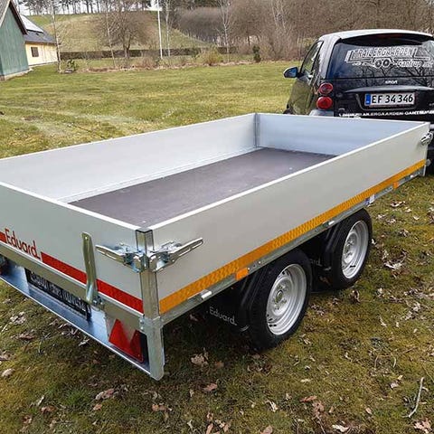 Eduard 2615-2700-56 MULTIEn stærk og robust boogietrailer med en totalvægt på 2700 kg, der kan holde til lidt af hvert. Eduard 2615-27-56-MU er som vores andre ED2615 modeller kendetegnet vedStabil v-trækvangeFuldsvejset galvaniseret chassisSider i aluminiumInd- og udvendige surringsøjerAftagelige hjørnestolperSider der kan lægges nedNæsehjulRobust trailer med stærkt chassisEduard 2615-27-56-MU et godt valg, hvis du leder efter en god, stærk og robust trailer. Boogietraileren der har en totalvægt på 2700 kg er bygget på et fuldsvejset galvaniseret chassis. Den har en egenvægt på 500 kg og giver dig mulighed for at laste helt op til 2200 kg. Tjek altid bilens registreringsattest for maksimal tilladt koblingsvægt. Det kan være dyrt at køre med overvægt.Ramper indbygget under ladMed Eduard 2615-27-56-MU får en boogietrailer med indbygget ramper under lad. Ramperne har en bæreevne på 1100 kg pr. rampe. Med ramper har du mulighed for at bruge boogietraileren til transport af maskiner. Med den indbyggede sliske til ramper, slipper du for at bruge ladet til opbevaring af ramper når du er ude og køre.Lad der kan udnyttes optimaltEduard 2615-27-56-MU er konstrueret så du har mulighed for at udnytte ladet optimalt. Hjulene er placeret under ladet på traileren, så du har mulighed for at udnytte ladets fulde bredde.Traileren er utrolig fleksibel. Alle fire hjørnestolper kan tages af og siderne kan lægges ned. Du kan således bruge både længde og bredde, når du skal læsse traileren. Læssehøjden er 56 cm, siderne er 30 cm høje og i aluminium. Trailerens indvendige længde er 256 cm og bredde er 149 cm.Sikker transport af lastEduard 2615-27-56-MU gør det let at sikre din last. Traileren har både ind-og udvendige surringsøjer, hvor du kan sikre din last, så den ikke rutsjer rundt under transport. Det er vigtigt for din køresikkerhed at lasten er sikret forsvarligt, så traileren ikke begynder at slingre.Husk nummerpladePrisen er ekskl. Nummerplade og nummerpladegebyr til 790 kr. (samme pris som hos SKAT). Vi har både EU- og almindelige nummerplader på lager.Ekstraudstyr til Eduard 2615-27-56-MUEkstra siderGittersiderFlad presenningHøj presenning, fås i flere højder