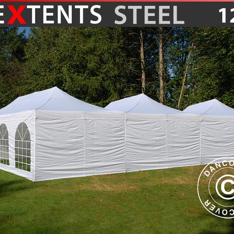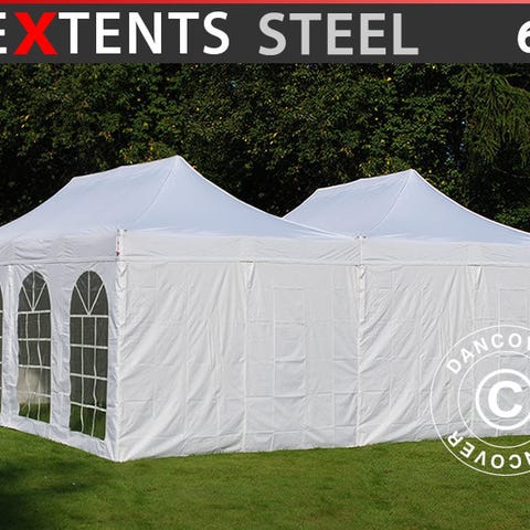 Foldetelt FleXtents Steel er et foldetelt i høj professionel kvalitet. Det funktionelle og holdbare foldetelt består af to selvstændige foldetelte (4x6 m). Sæt de to telte sammen ved at bruge de to medfølgende forbindelsesbeslag, tagrenden og de to samlestykker. OBS! De to foldetelte kan bruges enkeltvist til mindre arrangementer!