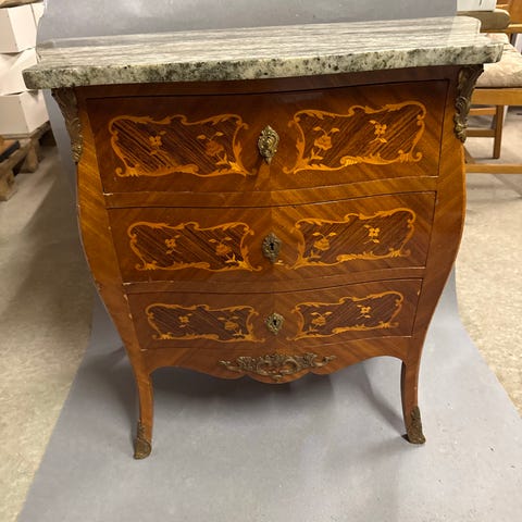 Nøddetræsfineret kommode med delvise forgyldninger og rødlig marmorplade