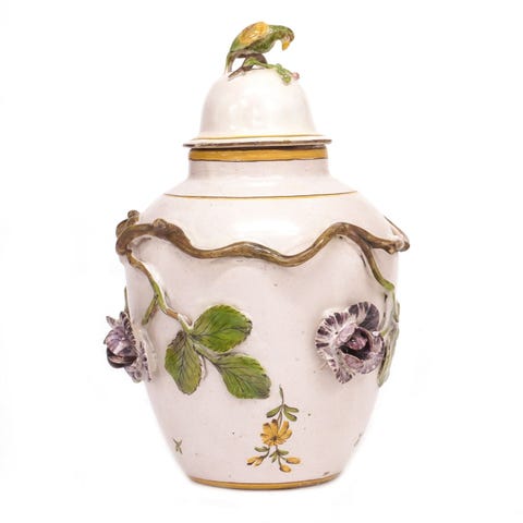 Polykromdekoreret potpourrivase i fajance