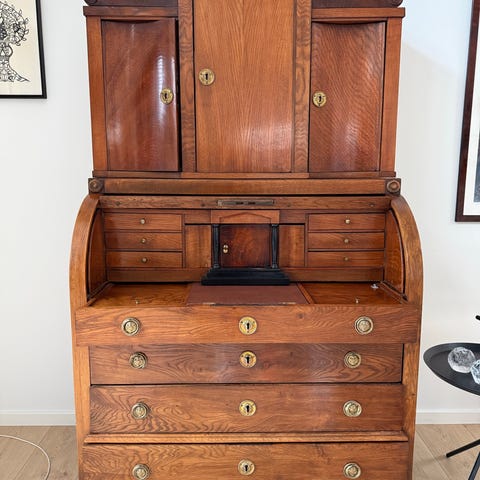 Skriveplade med trappeformede skuffer og låge med spejl
