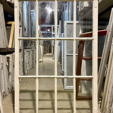 Større, smuk 12-ruders vinduesramme med smalle sprosser og kittede ruder. Med sundt træværk samt let afskallende maling og lidt løs kit. Fra større palæejendom i Taarbæk.