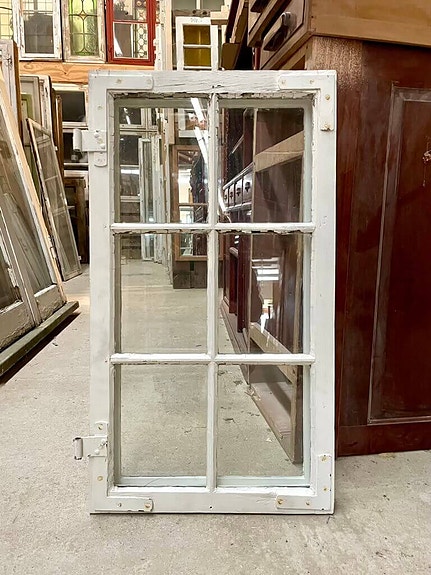 Klassisk, fransk enkeltdør med 15 små rudefelter adskilt af sprosser med pæne profiler. Flere ruder i gammelt glas. Monteret med smukke messinggreb og tilhørende nøgleskilte. Bredt og lavt mål. Med original karm og uden bundstykke.