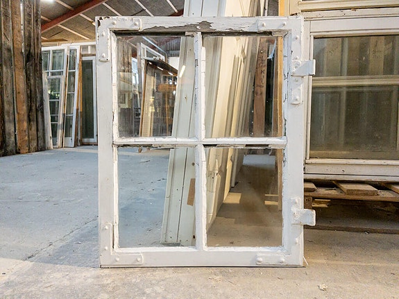 Typisk Dannebrogsvindue (to fag) med to-lags termoruder. Fremstillet i fyrretræ med drypnæser i aluminium. Fremstår pænt og med sundt træværk samt behov for et lag maling.