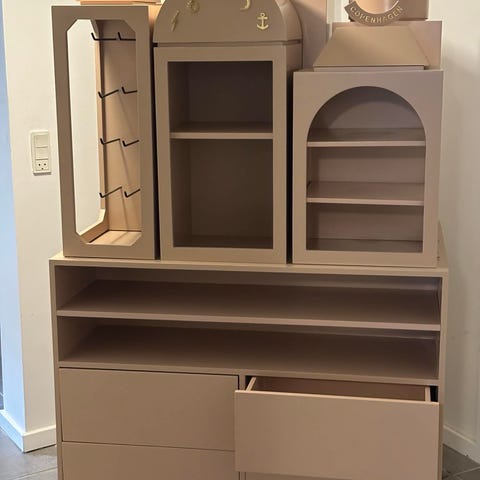 Bag låger hylder. Vitrine med træ- og glashylde