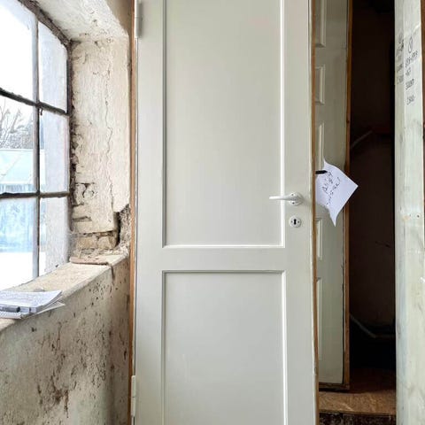 Klassisk, venstrehængt fyldningsdør med tre felter. Med original karm og pæne hamborghængsler. Uden bundstykke. Monteret med messinggreb og tilhørende nøgleskilte. Fremstår med let afskallende maling enkelte steder samt almindelige brugsspor.