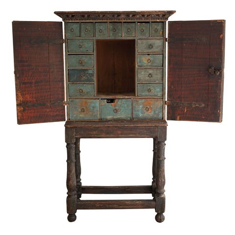 Røddekoreret rokoko natskab med to låger bag hvilke hylder