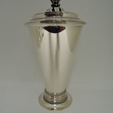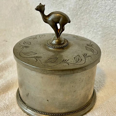 Rørchen i tin prydet med stiliserede blomster. Låg med mønt