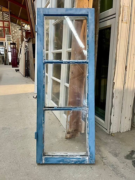 Angivne mål er inkl. karm og uden bundstykke - højde målt fra bunden af dørbladet til toppen af karmen. Pt. monteret med ikke-originalt bundstykke, der giver en total højde på 212 cm. Den gående dør er venstrehængt.