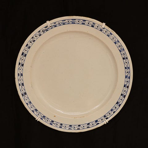 Stor blåligt dekoreret præsentérbakke i fajance. Signeret St